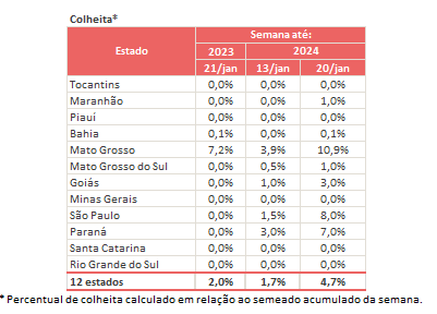 4,7% colhido. Em MT, a colheita alcança cerca de 10% da área total. As condições da cultura são distintas nas diferentes regiões, mas, no geral, as chuvas recentes amenizaram a escassez hídrica.