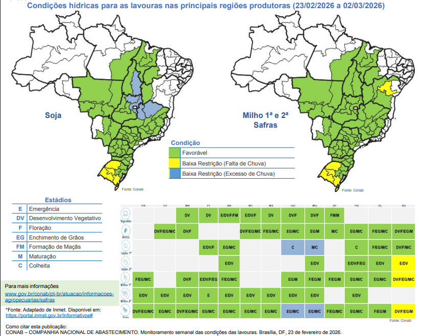 Em GO, a colheita avança no estado, mas em algumas regiões a qualidade dos grãos já é afetada pelo excesso de precipitações. Em MS, as chuvas ocorridas na semana causaram paralisação da colheita em alguns municípios, mas favoreceu as lavouras em enchimento de grãos.