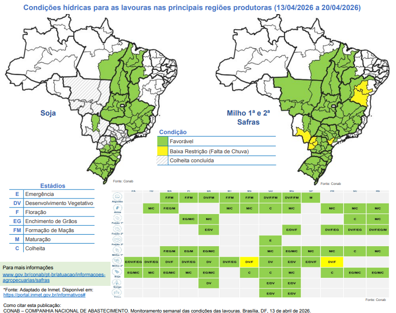 No MA, a colheita segue nas regiões Sul, Leste e Central. Nas demais, as lavouras estão entre floração e maturação. No PI, a colheita ultrapassa 84% da área. As lavouras tardias remanescentes estão no Sudoeste e no Norte. Em SC, as chuvas foram intermitentes e permitiram o avanço da colheita nas lavouras de primeira safra e melhores condições para as lavouras tardias. No PA, a colheita segue avançando. Os grãos apresentam boa qualidade, mesmo com as chuvas durante a maturação e colheita.