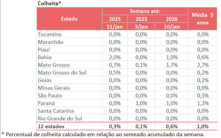 No país a semeadura chega a 98,2% da área total estimada. Em MT, o ritmo da colheita é cadenciado pela ocorrência de chuvas e a maturação da cultura. A operação deve acelerar no fim de janeiro. No RS, a ocorrência de chuvas em todo o estado favoreceu o desenvolvimento da cultura. Os produtores aproveitaram os períodos de tempo seco para a realização de tratos culturais.  As primeiras áreas semeadas já entraram no estádio de enchimento de grãos.