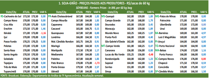Região de Balsas, no Maranhão, traz novas cotações marcando alta de R$ 1,00/saca, o que levou o preço a R$ 171,00, não se recuperando das quedas de R$ 15,00/saca na semana passada. O Porto Franco-MA manteve-se a R$ 167,00. Porto Nacional-TO, por sua vez teve seu preço mantido a R$ 164,90. Uruçuí-PI fechou o dia a R$ 165,00, também sem se movimentar.
