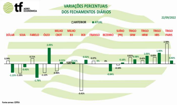 FECHAMENTOS DO DIA: O contrato de soja para novembro22 fechou em nova queda de 0,43% ou $ 6,25 cents/bushel a $ 1455,0. A cotação de maio23, que já está sendo negociada no Brasil, fechou em queda de 0,31%, ou $ 4,50 cents/bushel a $ 1466,25. O contrato de farelo de soja para outubro fechou em queda de 1,76% ou $ 9,0/ton curta a $ 446,7 e o contrato de óleo de soja para outubro fechou em alta de 2,05% ou $ 1,39 libra-peso a $ 69,22.