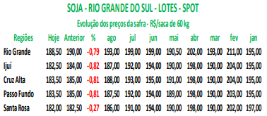 No interior, por sua vez, VARIAÇÕES HOMOGÊNEAS por quase toda a extensão do interior do Estado, com Ijuí, Cruz Alta e Passo Fundo perdendo também R$ 1,50/saca e indo respectivamente a R$ 182,50, R$ 183,50 e R$ 183,50. Apenas Santa Rosa passou por um dia de menor perda ao marcar desvalorização de R$ 0,50/saca e ir a R$ 182,00.