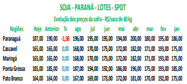 PREÇOS NO PORTO FUTUROS: os preços de todos os contratos marcaram queda de R$ 3,00/saca, com isso os preços foram de R$ 187,00 para 28/10, R$ 188,00 para 30/11 e R$ 189,00 para 15/12. PREÇOS NO INTERIOR: por estas regiões a configuração foi de total manutenção, nada de movimentos. Cascavel, Maringá, Pato Branco e Ponta Grossa seguem respectivamente a R$ 165,00, R$ 165,00 e R$ 164,00 e R$ 185,00.