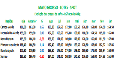 MERCADO: Os últimos dados trazidos para este Estado com os valores que serão vistos abaixo e na tabela ao lado. Esse mercado foi marcado por divisão entre os preços, com áreas de valorização e de perda plena de diferentes intensidades a depender da região. PREÇOS: Campo Verde a R$ 166,00 alta de R$ 2,70/saca. Lucas do Rio Verde a R$ 159,90, mantido sem variações. Nova Mutum a R$ 165,50, baixa de R$ 0,60/saca. Primavera do Leste a R$ 168,40, alta de R$ 1,90/saca. Rondonópolis, por sua vez, a R$ 170,50, sem se mover. Sorriso, por fim, a R$ 165,90, marcando baixa de R$ 0,50/saca.