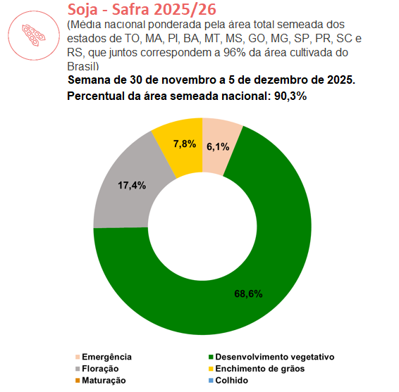 Em MT, as precipitações recorrentes e em bons volumes têm ajudado o desenvolvimento e a recuperação de lavouras afetadas pelo déficit hídrico de novembro. No RS, as áreas semeadas após a primeira quinzena de novembro apresentam falhas na germinação e no estabelecimento da cultura devido à falta de chuvas, e muitos talhões serão replantados.