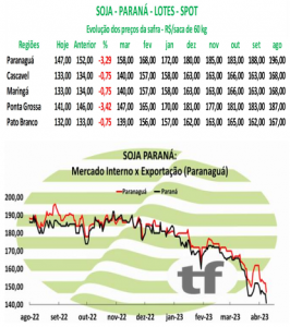 CONTEXTO DO DIA: como explicado ontem, quedas são interpoladas por altas pontuais que de forma geral voltam a cair nos dias seguintes. O contexto do mercado segue de forma muito predominante negativo e o produtor sem interesse em efetuar negócios mantém seu foco no campo que no momento atual permanece com bom tempo. O mercado vê muita oscilação, o que gera incerteza, além disso os preços estão comparativamente baixos no Paraná. NO PORTO: cif Paranaguá a R$ 147,00 com pagamento em 30/04 e entrega em abril marcando baixa de R$ 5,00/saca. NO INTERIOR: o mercado de soja spot Ponta Grossa registrou baixa de R$ 5,00/saca, seu preço foi a R$ 141,00. Nas demais posições de Cascavel, Maringá e Pato Branco, os valores marcaram queda de R$ 1,00/saca. Os preços foram respectivamente de R$ 133,00, R$ 133,00 e R$ 132,00. NO BALCÃO: Os preços em Ponta Grossa ficaram em R$ 140,00, marcando queda de R$ 2,00/saca. AS COTAÇÕES INTERNACIONAIS: o complexo de soja foi predominantemente positivo no fechamento, com o grão de soja passando por alta de 0,55%, o farelo em alta de 0,68% e o óleo em baixa -1,68%. O dólar por sua vez, caiu de forma muito expressiva, perdendo -1,42% e sendo cotado a R$ 4,9342 ao fim do pregão.