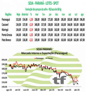 CONTEXTO DO DIA: como explicado ontem, quedas são interpoladas por altas pontuais que de forma geral voltam a cair nos dias seguintes. O contexto do mercado segue de forma muito predominante negativo e o produtor sem interesse em efetuar negócios mantém seu foco no campo que no momento atual permanece com bom tempo. O mercado vê muita oscilação, em especial hoje em virtude da possibilidade de menores estoques nos EUA. NO PORTO: cif Paranaguá a R$ 152,00 com pagamento em 30/04 e entrega em abril marcando baixa de R$ 2,00/saca. NO INTERIOR: o mercado de soja spot Ponta Grossa registrou baixa de R$ 2,00/saca, seu preço foi a R$ 146,00. Nas demais posições de Cascavel, Maringá e Pato Branco, os valores marcaram queda de R$ 3,00/saca. Os preços foram respectivamente de R$ 134,00, R$ 134,00 e R$ 133,00. NO BALCÃO: Os preços em Ponta Grossa ficaram em R$ 142,00, marcando queda de R$ 2,00/saca.