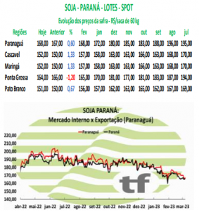 CONTEXTO DO DIA: Quedas são finalmente parando e cenário da região dá sinais de que será positivamente impactado pela competição entre PR e RS. As valorizações de preços ainda não foram expressivas, mas pequenos volumes estão saindo todo dia, hoje não foi diferente, com volumes abaixo de 1.000 toneladas sendo negociados. PREÇOS DE HOJE: No porto de São Francisco do Sul, o preço ficou a R$ 168,00 para abril com entrega ainda em março, marcando manutenção.