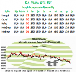 CONTEXTO DO DIA: preços seguem marcando quedas expressivas diante da queda dos prêmios e crescimento da oferta causada pela super safra em algumas regiões. Diante da decadência dos valores praticados, produtor fecha suas portas e não demonstra vontade de efetuar negócios com fábricas ou tradings. PREÇOS DE HOJE: No porto de São Francisco do Sul, o preço ficou a R$ 165,00 para abril com entrega ainda em março, marcando queda de R$ 2,00/saca.