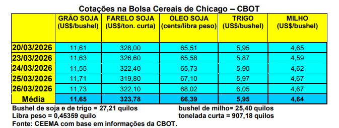 Sob pressão das idas e vindas da guerra no Oriente Médio, o mercado espera com atenção o relatório de intenção de plantio nos EUA, previsto para o próximo dia 31/03. Existe forte tendência de uma redução na área a ser semeada com soja em 2026 naquele país. Caso isso se confirme, o movimento tende a ser baixista para as cotações da oleaginosa logo