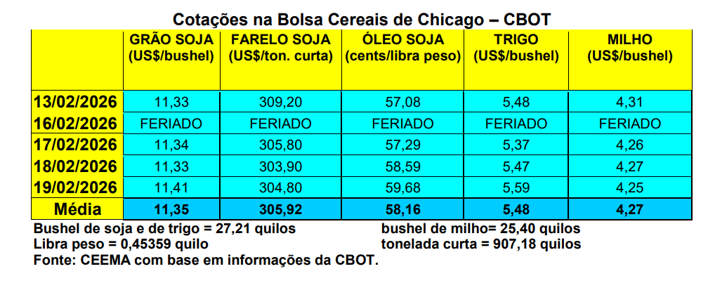 Afora isso, a principal notícia vem do início do tradicional Fórum Outlook do USDA, neste dia 19/02, onde as primeiras estimativas de área a ser semeada, para 2026/27, são anunciadas. Lembrando que a intenção de plantio será anunciada em 31 de março, que o forte do plantio se desenvolve em maio e que a área realmente cultivada nos EUA virá em 30 de junho. Dito isso, o Fórum indicou um expressivo aumento na área a ser semeada com soja neste novo ano.