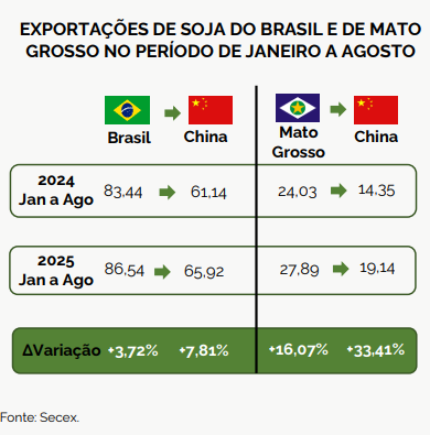 Quanto ao consumo chinês da soja mato-grossense, o país respondeu por 82,40% dos embarques do estado em agosto. No acumulado de 2025, as compras da China somaram 19,14 milhões de toneladas, volume 33,41% superior ao registrado entre jan/24 e ago/24.