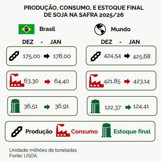 Esse incremento está atrelado, principalmente, à projeção de 178,00 milhões de t na produção brasileira de soja da safra 25/26, elevação de 1,71% frente à estimativa de dez/25, reflexo da expansão da área semeada, aliada à melhor perspectiva climática no país. No que se refere ao consumo mundial, a projeção subiu 0,31% ante dez/25, sendo estimada em 423,14 milhões de t.