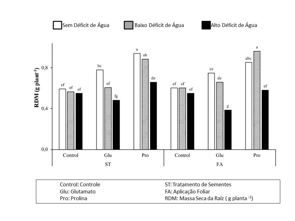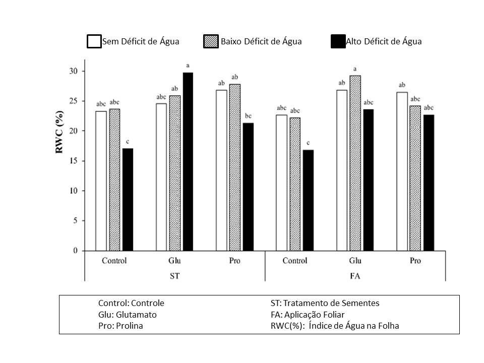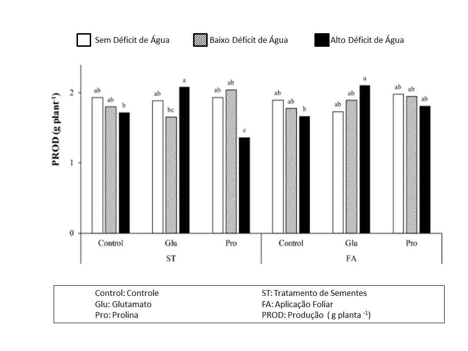 Ainda conforme Teixeira et al, (2019), plantas submetidas a um déficit hídrico moderado somente demonstraram somente uma resposta via aplicação foliar de prolina. Para plantas expostas a alto déficit hídrico, o tratamento de semente com glutamato aumentou o teor relativo de água, a massa seca das plantas e a produtividade.
