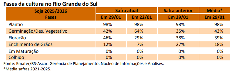 A semeadura permanece em 98% da área prevista, mas deve ser concluída nos próximos dias, a partir da reposição de umidade nos solos. Em termos fenológicos, estima-se que 42% das lavouras estejam em fase vegetativa, 46% em floração e 12% em enchimento de grãos.
