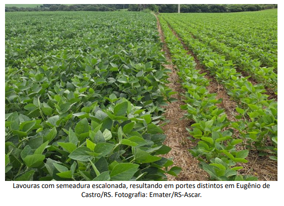 Na região administrativa da Emater/RS-Ascar de Bagé, na Fronteira Oeste, as lavouras apresentam bom potencial produtivo, com parcelas em floração e início de enchimento de grãos sob crescente estresse hídrico, devido à má distribuição das chuvas nos primeiros Informativo Conjuntural. Porto Alegre, n. 1904, p. 6, 29 jan. 2026. decêndios de janeiro e às temperaturas elevadas. Em áreas de solos arenosos e menor investimento em fertilidade, como em Maçambará, há sintomas mais acentuados de déficit hídrico, como murcha e queda de folhas do terço inferior. Parte das lavouras implantadas após a colheita de milho demandou irrigação para garantir a germinação.