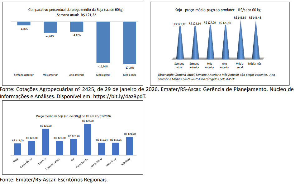 Na região administrativa da Emater/RS-Ascar de Bagé, na Fronteira Oeste, as lavouras apresentam bom potencial produtivo, com parcelas em floração e início de enchimento de grãos sob crescente estresse hídrico, devido à má distribuição das chuvas nos primeiros Informativo Conjuntural. Porto Alegre, n. 1904, p. 6, 29 jan. 2026. decêndios de janeiro e às temperaturas elevadas. Em áreas de solos arenosos e menor investimento em fertilidade, como em Maçambará, há sintomas mais acentuados de déficit hídrico, como murcha e queda de folhas do terço inferior. Parte das lavouras implantadas após a colheita de milho demandou irrigação para garantir a germinação.