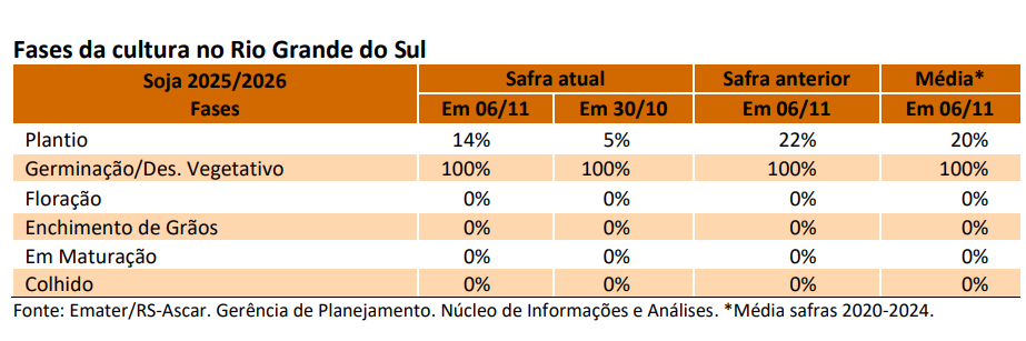 Na de Soledade, as chuvas do período elevaram significativamente a umidade do solo, viabilizando a retomada intensa da semeadura, que atinge 22% do previsto. As precipitações também favoreceram a germinação e a emergência das áreas implantadas antes dos eventos pluviométricos. No Baixo Vale do Rio Pardo, onde a limitação hídrica em outubro foi mais severa, o percentual de área semeada está inferior ao observado no Alto da Serra do Botucaraí e no Centro Serra. Em algumas propriedades, a demora na retirada de rebanhos de áreas arrendadas contribuiu adicionalmente para o atraso das operações. Prossegue a dessecação de áreas destinadas a semeaduras tardias, previstas para o final de novembro.