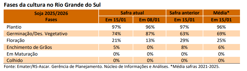 Na de Santa Rosa, cerca de 92% da área prevista foi semeada, e 15% desse total estão em floração. As chuvas excessivas ocorridas no final de dezembro de 2025 podem resultar em pequenas perdas. Contudo, considerando que a maior parte das lavouras se encontra em estágios iniciais de desenvolvimento, essas perdas ainda poderão ser parcialmente revertidas.