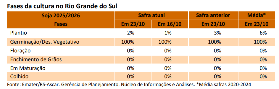 A semeadura está em fase inicial no Estado, alcançando 2%, limitada a áreas com condições adequadas de umidade. O avanço reduzido resulta da combinação entre fatores econômicos e físicos, como: a estratégia de produtores de postergar o plantio, minimizando riscos de redução da disponibilidade hídrica em novembro e dezembro; a priorização da colheita dos cereais de inverno; as baixas temperaturas e a diminuição da umidade nos solos, em parte do Estado.