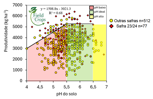 Corroborando o impacto do baixo pH na produtividade da soja, estudos conduzidos pela Equipe FieldCrops demonstram que a cada 0,1 de pH abaixo de pH 5,5 a produtividade de grãos reduz em 151 kg ha-1, ou seja, aproximadamente 2,5 sc ha-1. Esses estudos contemplaram 512 lavouras de soja durante as safras 2015/2016 a 2020/2021. Vale destacar que nessa correlação, não foram consideradas as lavouras da safra 2023/2024 (em vermelho), apenas utilizadas para visualização na figura 1.