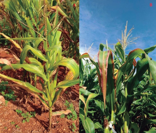 Figura 1. Planta de milho com sintomas do enfezamento pálido (A) e enfezamento vermelho (B).