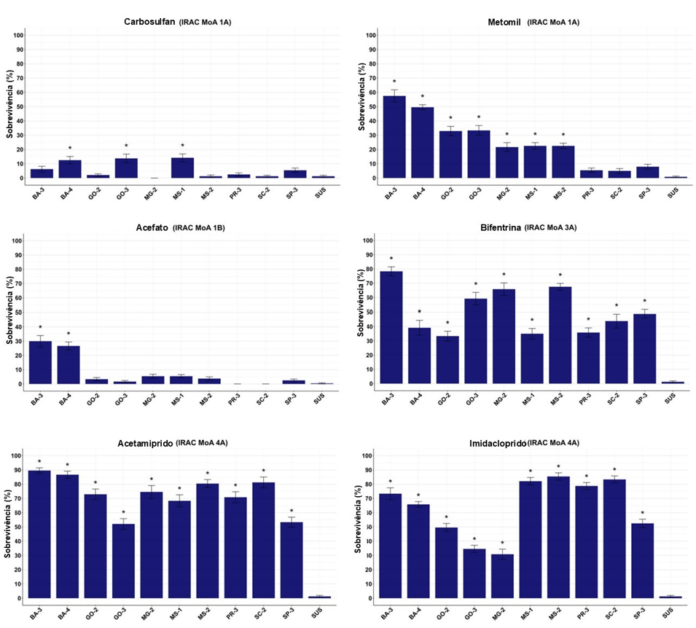 Figura 2. Sobrevivência de populações de campo de Dalbulus maidis coletadas no ano agrícola de 2022 a 2023 na concentração diagnóstica de diferentes inseticidas. A sobrevivência (média ± IC) seguida de asteriscos indica diferença significativa (P < 0,05) entre as populações de campo e o SUS (Suscetibilidade de referência) usando o teste de Kruskal-Wallis seguido do teste post hoc de Dunn.
