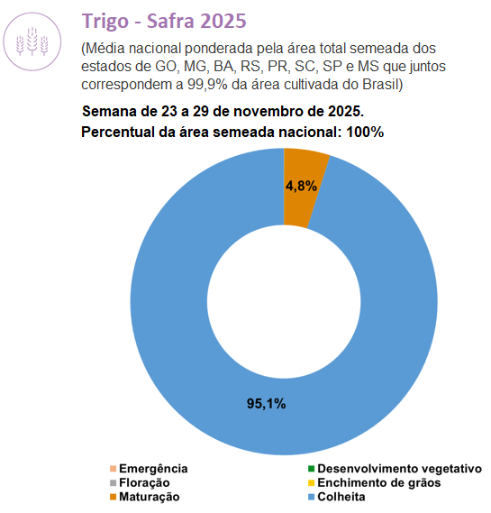 No PR, a colheita está praticamente concluída, restando apenas pequena fração das áreas em maturação. O tempo mais firme observado ao longo da semana permitiu o avanço das operações nas lavouras remanescentes. No RS, a colheita se aproxima do fim. O tempo seco e as temperaturas mais elevadas contribuíram para a secagem uniforme da palha e dos grãos, acelerando o ritmo das operações e que favoreceram a qualidade do produto, resultando em maturação adequada e PH elevado nas lavouras em colheita. Na metade oeste, a operação já está concluída. No Planalto Superior, ainda restam áreas por colher.