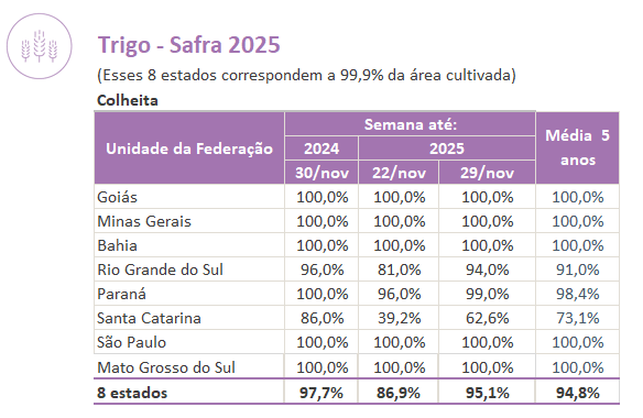 Em SC, a colheita avançou de forma consistente ao longo da semana, impulsionada pelo retorno do tempo seco. Apesar dos episódios recentes de alta umidade, ventos fortes e chuvas volumosas, o produto vem apresentando rendimento satisfatório, dentro dos padrões exigidos pela indústria moageira. Houve registros de perdas pontuais em áreas de cultivares mais precoces, decorrentes da limitação das aplicações preventivas de fungicidas diante das Condições climáticas desfavoráveis.