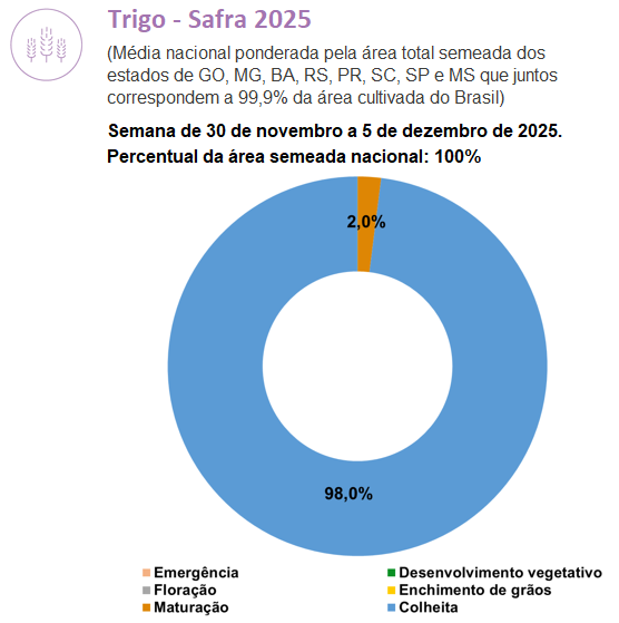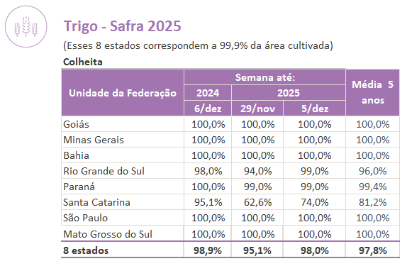 No PR, a colheita está praticamente concluída. O tempo mais firme favoreceu a realização das operações nas lavouras remanescentes. No RS, a colheita avançou e se aproxima do encerramento. O tempo seco contribuiu para boa secagem das plantas e qualidade dos grãos, com peso hectolítrico próximo de 80. As áreas restantes concentram-se no Planalto Superior, onde o ciclo é naturalmente mais tardio, com maturação e secagem adequadas.