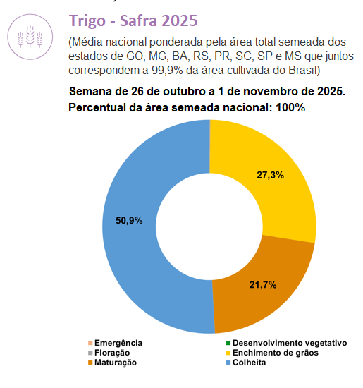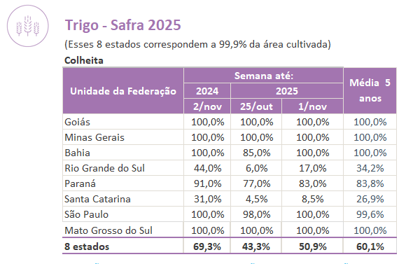 No RS, a colheita encontra-se atrasada em relação à safra anterior, reflexo da semeadura mais tardia e das temperaturas mais baixas observadas neste ciclo. Houve chuvas de volumes moderados, intercalados por dias sem chuva e com vento, favorecendo a manutenção da qualidade dos grãos. Em algumas regiões, a precipitação foi inferior à média, o que também contribui para reduzir a umidade. No campo, observa-se também a dessecação pré-colheita. Em SC, a colheita apresenta boa produtividade, embora a umidade elevada no final do ciclo tenha aumentado a incidência de doenças.