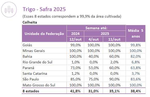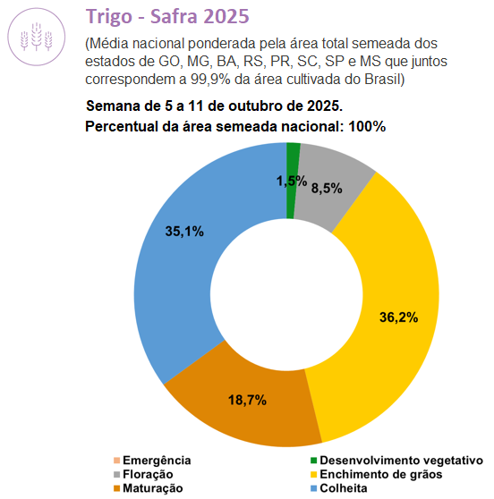 Em SC, as lavouras da Serra e dos Planaltos aproximam-se do final do desenvolvimento vegetativo. No Meio-Oeste, prevalecem as fases de alongamento, floração e formação de grãos, enquanto, no Extremo-Oeste, a cultura entra na fase final do ciclo. As condições recentes de umidade e nebulosidade ampliam o risco de doenças de espiga, especialmente giberela. Apesar disso, o potencial produtivo permanece elevado. Em SP, a colheita segue em ritmo avançado. Na BA, as lavouras da safra 2024/25 seguem em bom desenvolvimento.