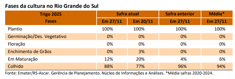Na de Caxias do Sul, a colheita avançou rapidamente nas áreas de menor altitude. Nos Campos de Cima da Serra predominam lavouras em maturação; muitas dessecadas para a antecipação da operação e posterior implantação da soja. Os cultivos apresentam excelente condição fitossanitária e potencial produtivo elevado, convergindo para rendimentos superiores à média estadual. Cerca de 80% se encontra em maturação, e 20% colhidos.