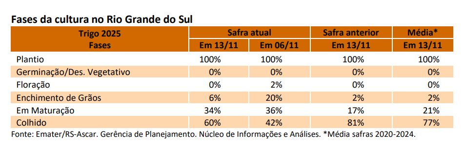 A colheita do trigo no Estado foi acelerada no período com o objetivo de antecipar a retirada das lavouras prontas antes das chuvas e dos ventos intensos, que estavam previstos para o dia 07/11. A área colhida se elevou de 42% para 60% do total semeado. Porém, esse percentual ainda está inferior à média dos últimos cinco anos, quando, na mesma época, alcançava-se 77%.