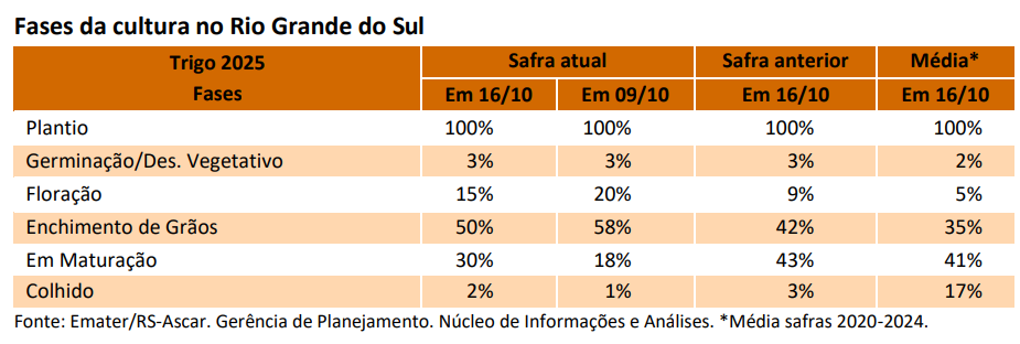Na de Pelotas, 79% dos cultivos estão em enchimento de grãos; 9% em floração; 7% em maturação; e 5% colhidos. As condições climáticas do período contribuíram para o desenvolvimento das plantas. A expectativa é de manutenção da produtividade dentro da normalidade histórica.
