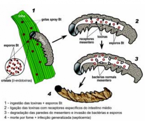 O Bacillus thuringiensis (Bt) é uma bactéria Gram positiva, que pode ser caracterizada pela sua habilidade de formar cristais proteicos durante a fase estacionária e/ou de esporulação. O mecanismo de ação das proteínas Cry de Bt envolvem a solubilização do cristal no intestino médio do inseto, causando sua morte (Carneiro et al., 2009).