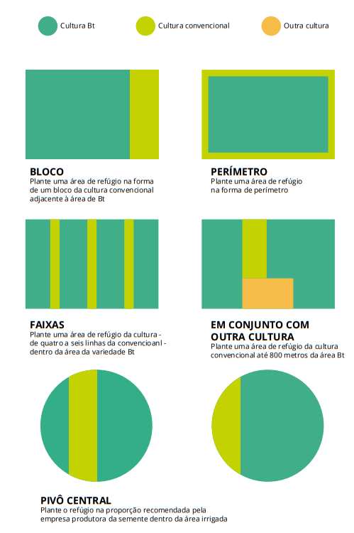 As áreas de refúgio devem ser cuidadosamente planejadas no sistema de produção, atendendo alguns requisitos básicos, como tamanho correspondente a 10% da área cultivada de milho, as áreas de refúgio devem ser semeadas com híbridos ou variedades não Bt, o ciclo da variedade ou híbrido semeado no refúgio deve ser similar ou mais próximo possível a cultura Bt, e deve ser semeado ao mesmo tempo das áreas Bt. Além disso, o refúgio deve ser formado por um bloco de plantas não Bt, que se encontra a menos de 800 metros da área de cultivo Bt, sendo 800 metros a distância máxima entre qualquer planta Bt e uma planta da área de refúgio.