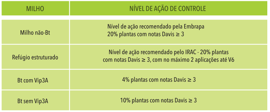 Tabela 1. Nível de ação para o controle de lagartas em milho Bt e áreas de refúgio, com foco no controle da lagarta lagarta-do-cartucho (Spodoptera frugiperda).